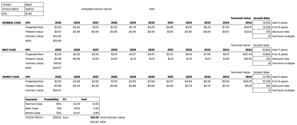 The analysis indicates that BRKR is overvalued at its current price of $37.24, given that the calculated intrinsic value is approximately $27.35. This suggests that the market is valuing the company beyond its ability to generate future earnings. The multiples and ratios (P/E, P/B, ROE) should be compared with industry averages to assess whether they are in line with the company’s maturity. In this case, the margin of safety is insufficient, indicating significant risk for investors.