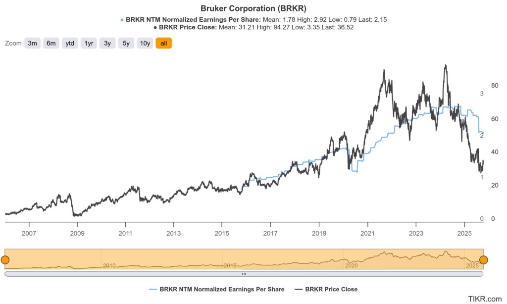 From a value perspective, the long-term price action for Bruker Corporation (BRKR) has exhibited a significant concern, particularly in the period from 2020 to 2024. During this time, the BRKR Price Close dramatically outpaced its fundamentals, showing an extreme divergence from the NTM Normalized EPS trend. This suggests the stock was trading at highly inflated multiples, disconnected from its underlying earnings power and relying heavily on speculative growth assumptions. As of late 2024 and 2025, the market has executed a sharp correction, significantly eroding the share price and closing the historical valuation gap. While this deleveraging of the multiple brings the price closer to a rational level—validating the view that the stock was previously overvalued—investors must now assess whether the current valuation offers a genuine margin of safety or if further earnings deceleration has been priced in.